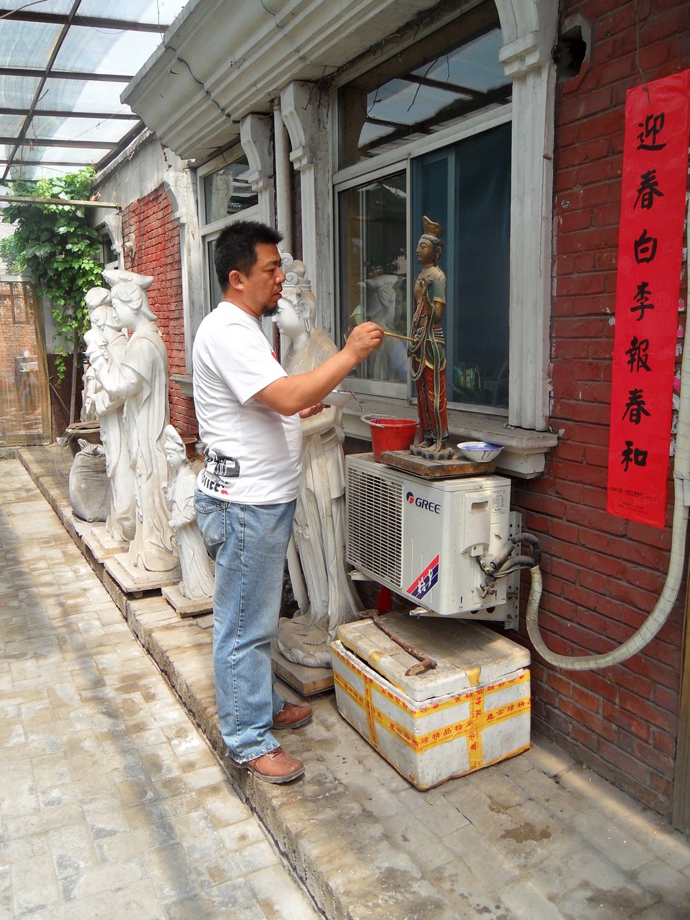 彩塑的制作过程大致分为立骨、塑肉、穿衣、装銮4个步骤。一、立骨(即立轲)这是彩塑的第一步非常重要。首先根据设计画稿(粉本)选择合适的木料搭立骨架。二、塑肉(即是上粗泥)这是彩塑的第二道工序。选泥土著人要先过筛,弃掉杂质再掺和一定比例的水、细沙、碎草、麻刀等含纤维之物,粗泥配好后堆积于骨架谷草之上,塑出人物的基本体形,结构比例和大体动势。三、穿衣(即上细泥)是彩塑的第三道工序。沙土筛好后均匀掺和棉花水和匀,反复搅拌揉和。四、装銮(即装饰彩绘)是彩塑的最后工序。彩绘常用颜料为矿物质,即佛青(群青)、钛白、石黄、土红、赭石、铝粉、白土子、土绿、巴黎绿(法国进口)、银朱红、黑烟。